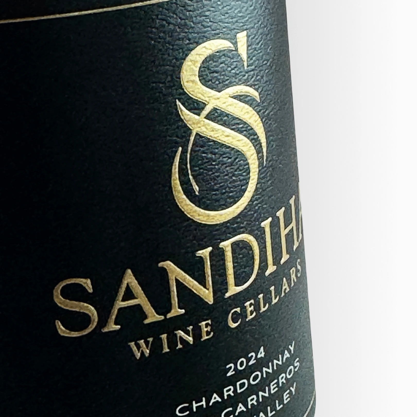 This label features a sophisticated interplay of gold and green foil, sculpted embossing, and a subtle background spot varnish, creating a finish that feels dimensional, intentional, and quietly luxurious.
